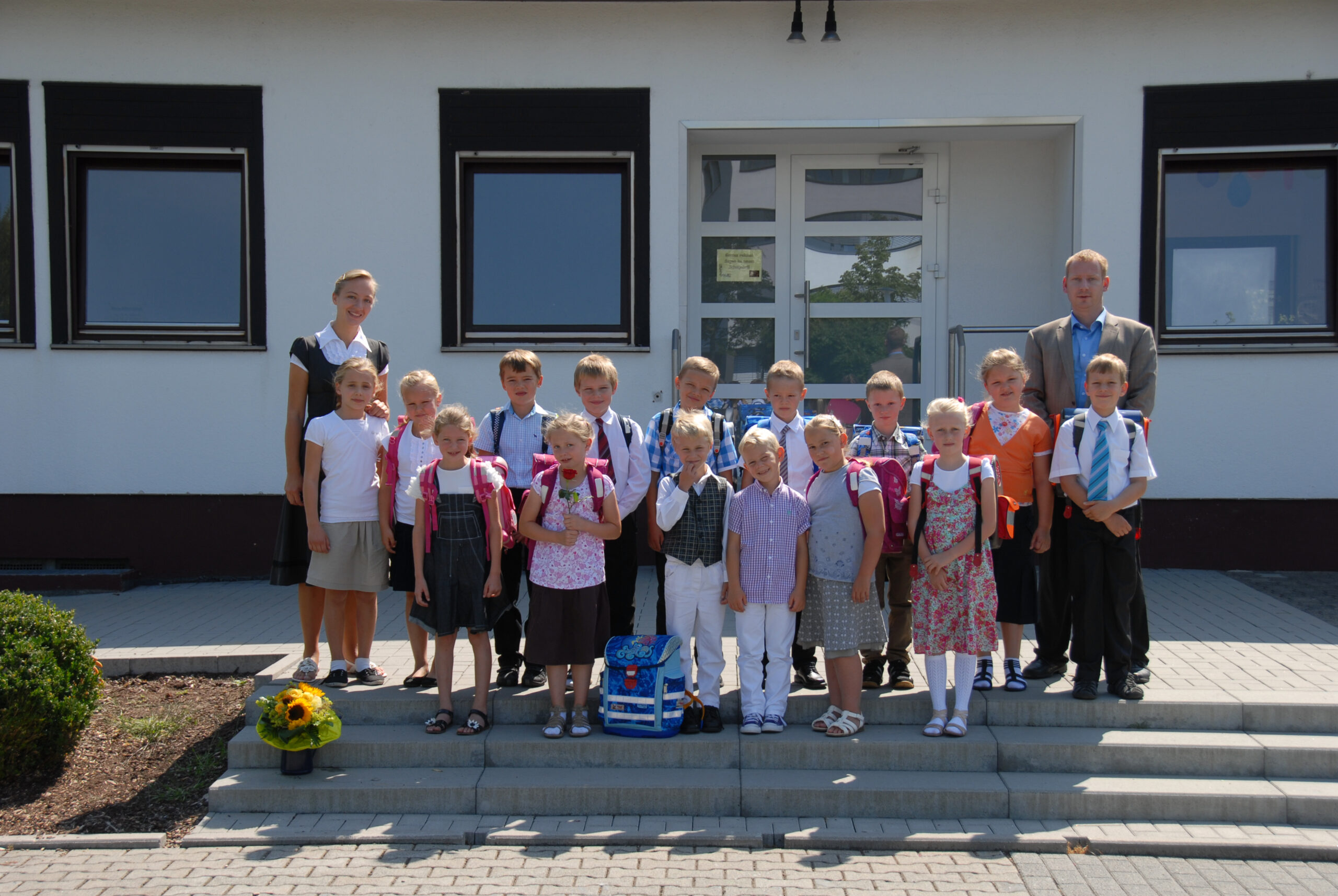 Die Eröffnung der Schule mit einer zweistufigen Klasse, einem überschaubaren Personal und einem Klassen- und Lehrerzimmer.